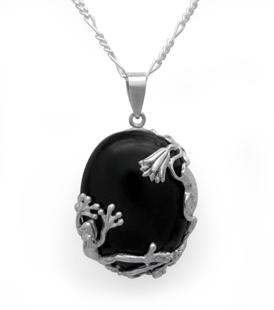 Loading... Please wait...Sterling silver frog jumping among some lily pads and flower over smooth onyx stone pendant necklace. Pendant hangs on sterling silver silver chain. Pendant is approx. 1 7/16 inch tall including the bail. Pendant is approx. 7/8 inch wide.