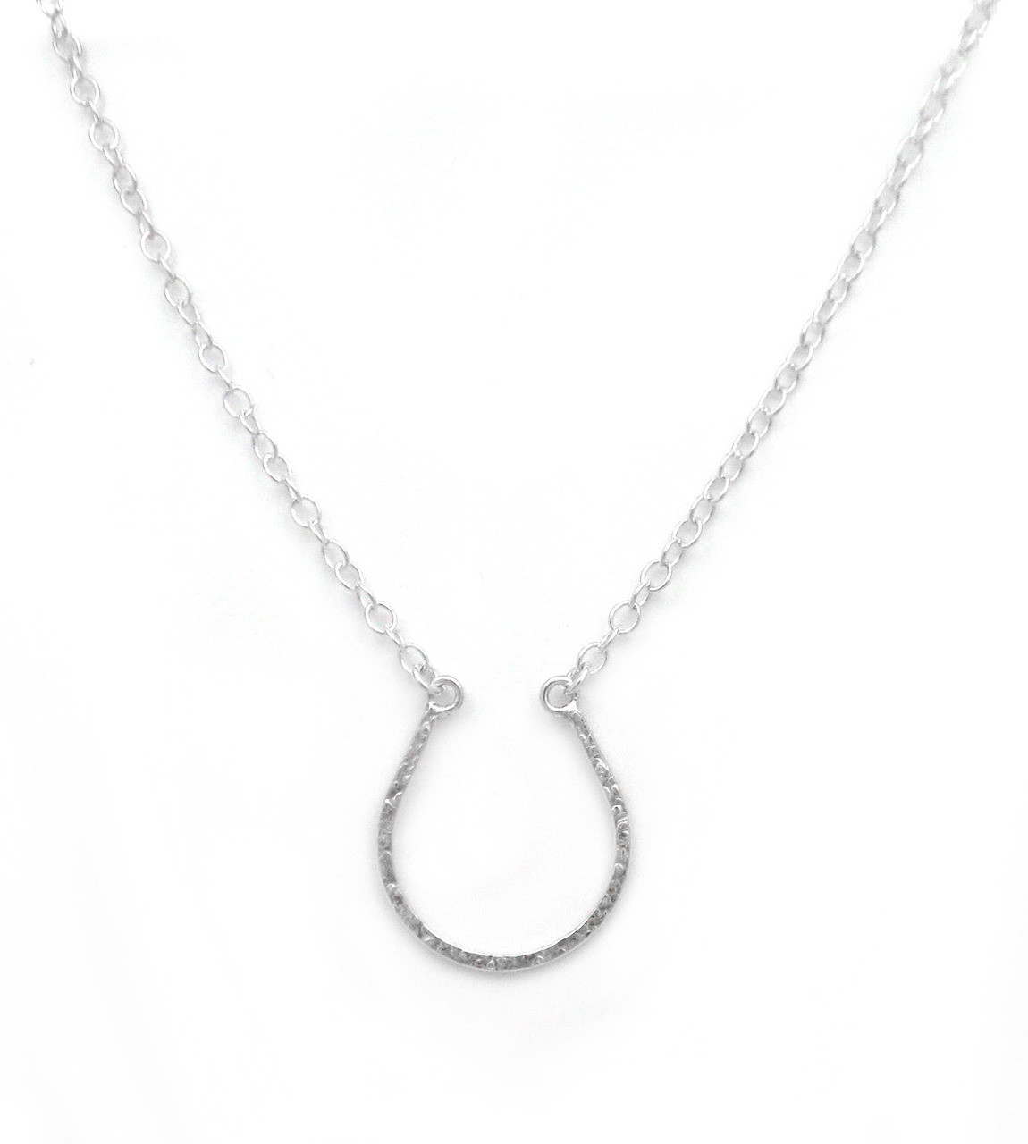 Loading... Please wait...Horseshoe suspended charm necklace. The charm is lightly hammered for texture and interest. Charm is about 3/4" wide and almost 1" tall. Wear it for a bit of luck! Perfect gift for someone that loves horses or likes to wear lucky charm. The chain is 16" plus 2" extender. Photo enlarged to show details.