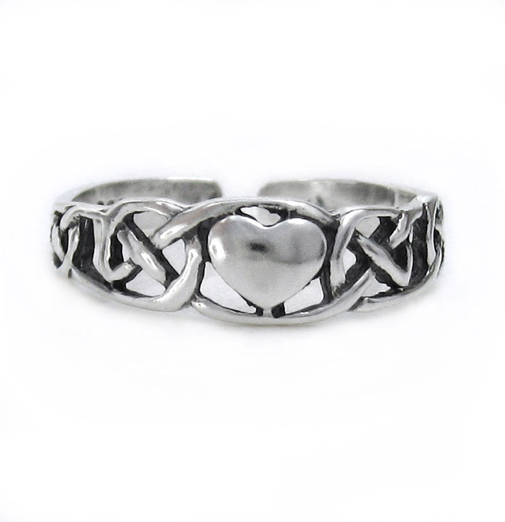 Heart at the center and open elegant interwoven Celtic knot design to the sides. Toe ring is a great accent on your foot. Toe ring is perfect summer accessorizing. Antique finish on polished silver. Slide on toe ring from the top of the toe, do not bend the band open. Adjustable toe ring accommodates many sizes. Photo enlarged to show details.
