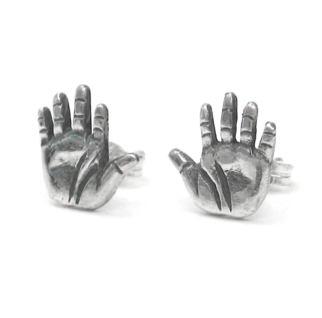 Talk to the hand! Sterling silver post earrings with antique finish to enhance the details. Photo enlarged to show details.