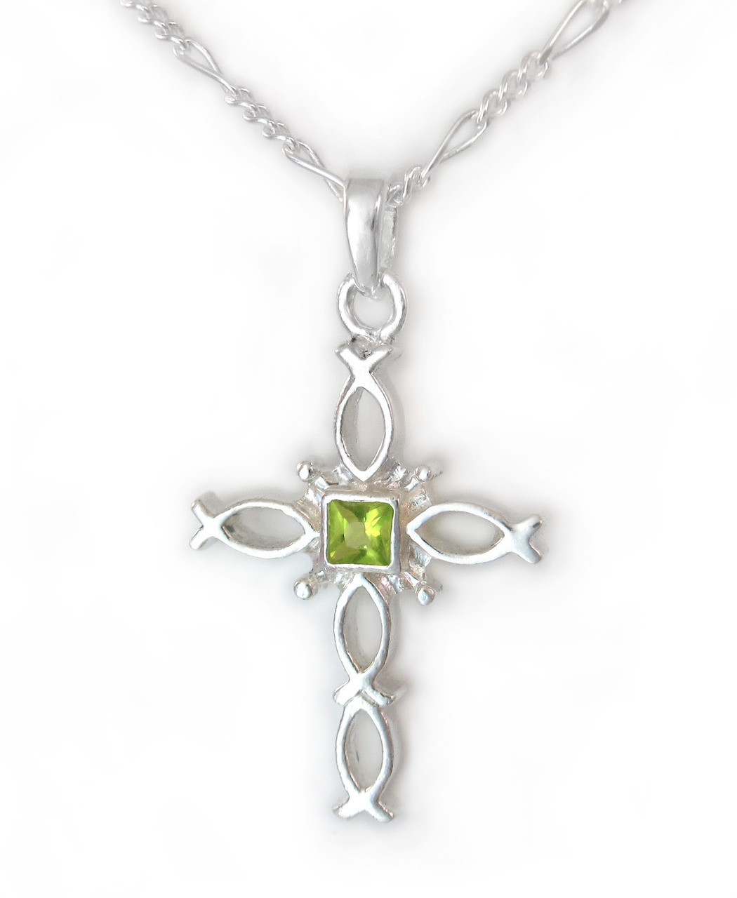 Sterling Silver Ichthus Fish Cross and Birth Crystal Necklace, August Green
