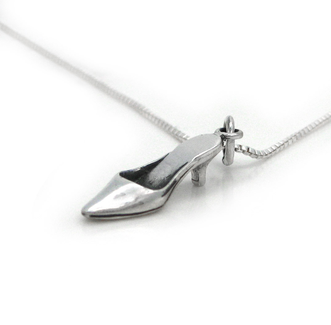 Sterling silver kitten heel three dimensional charm necklace. Shoe lovers will get a kick out of wearing this necklace. Chain is included. Antique finish to enhance the details. Photo enlarged to show details.