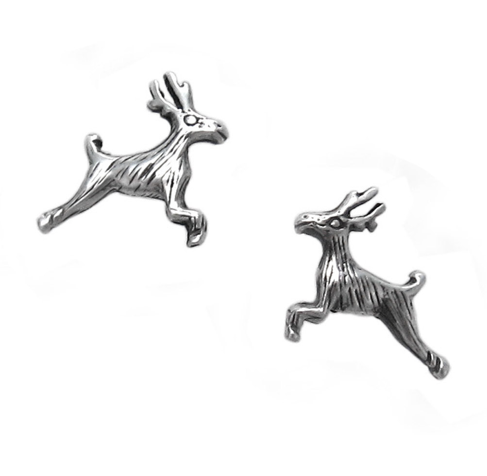 Leaping deers with antlers stud post earrings. Earrings are small enough to be comfortable for everyday wear. Antique finish to enhance the details. Photo enlarged to show details.