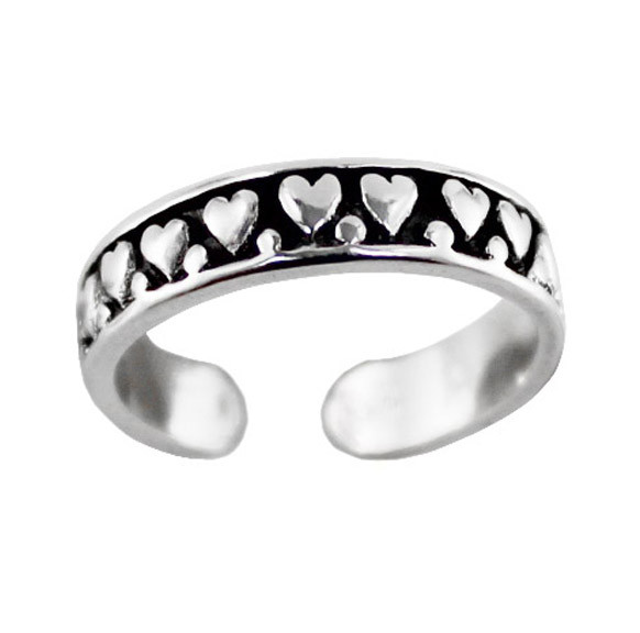 Loading... Please wait...Sweet little hearts design on polished band toe ring is a great accent on your foot. Band toe ring is perfect summer accessorizing. Antique finish on polished silver. Slide on toe ring from the top of the toe, do not bend the band open. Adjustable toe ring accommodates many sizes. Photo enlarged to show details.