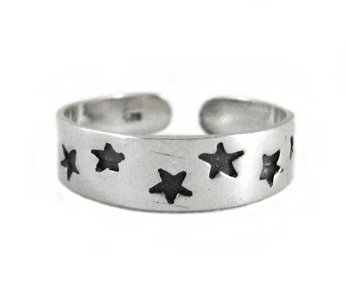 Little stars randomly sprinkle across polished band design toe ring is a great accent on your foot. Band toe ring is perfect summer accessorizing. Antique finish on polished silver. Slide on toe ring from the top of the toe, do not bend the band open. Adjustable toe ring accommodates many sizes. Photo enlarged to show details.