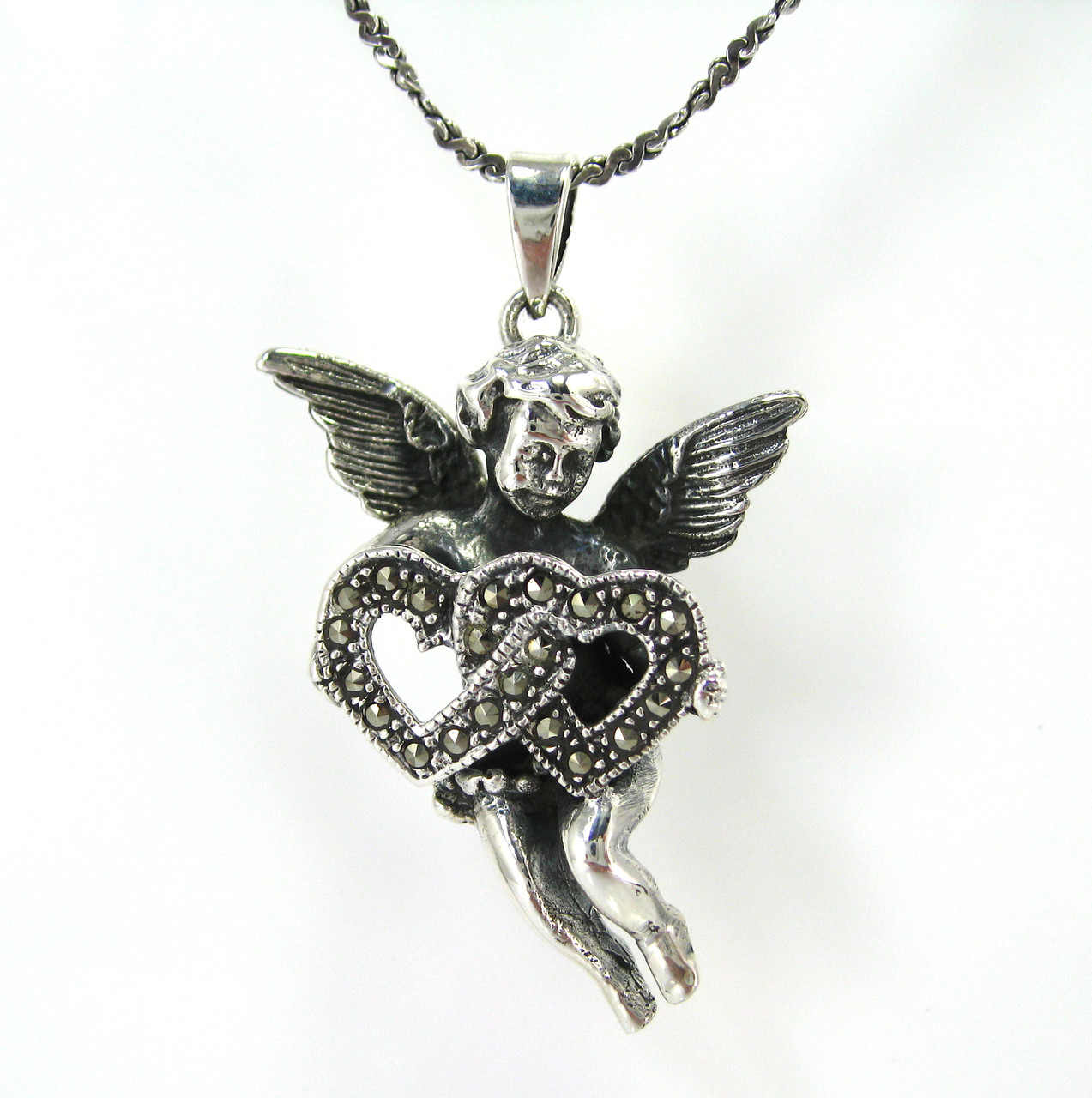 Click the button below to add the Sterling Silver Marcasite Cherub Double Hearts Pendant Necklace to your wish list.