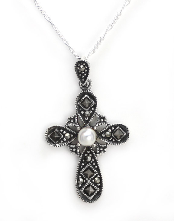 Loading... Please wait...Marcasite encrusted cross set with a simulated pearl at the center has a old world charm that it timeless and beautiful. A great size to wear everyday. White for purity. A great cross to wear to almost any occasion. Antique finish sterling silver. 18" chain is included. Photo enlarged to show details. Cross pendant is approximately 7/8 inch wide by 1 1/2 inch tall with bail.