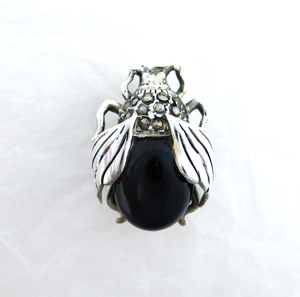 Vintage beetle brooch with marcasite accent and onyx body. Completely three dimensional and detailed. It measures 1.5 inches (2 cm) from top to bottom. Stamped 925 in back.