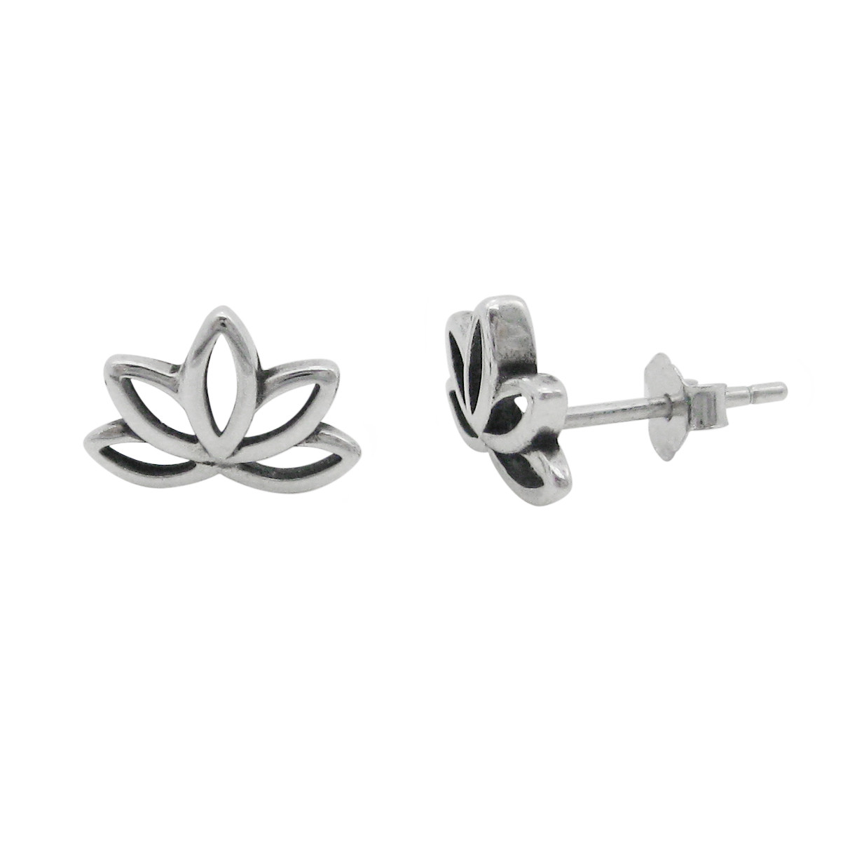 Sterling silver open cutout lotus flower stud post earrings. Earring is approximately 3/8 inch (10mm) wide and 1/4 inch (7mm) tall. Post and butterfly backs for pierced ears.