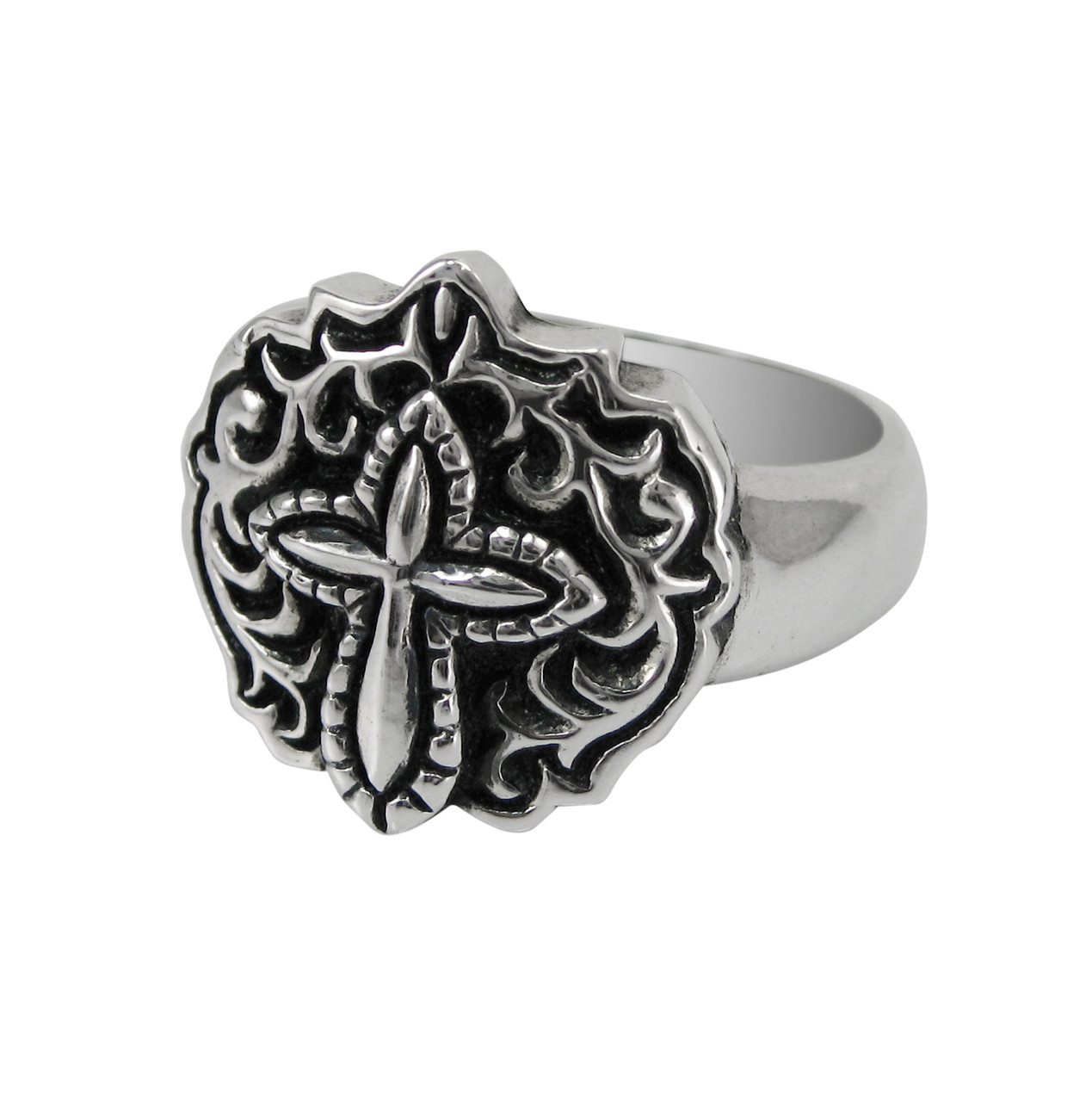 Sterling silver ornate swirls cross ring. Antique finish to contrast and enhance the design.