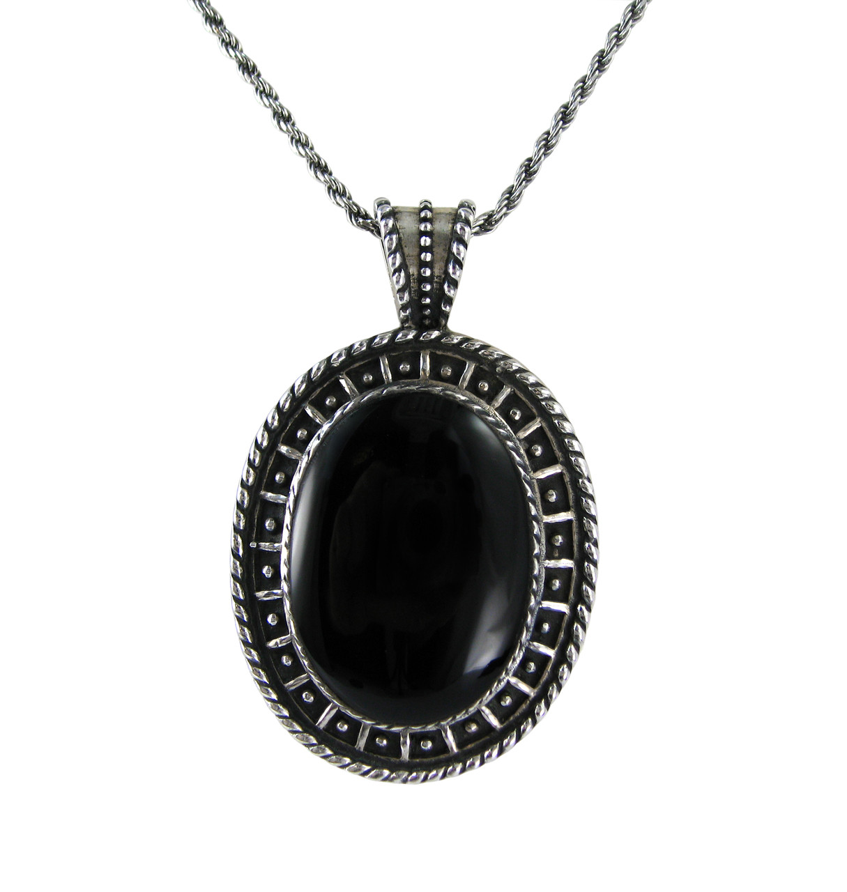 Loading... Please wait...Sterling silver geometrical design framing an oval stone pendant necklace. Pendant is approx. 1 2/16 inch wide (29mm). Approx. 1 7/8 inch tall including bail (47mm). Smooth, polished reconstituted stone. Sterling silver chain is included.
