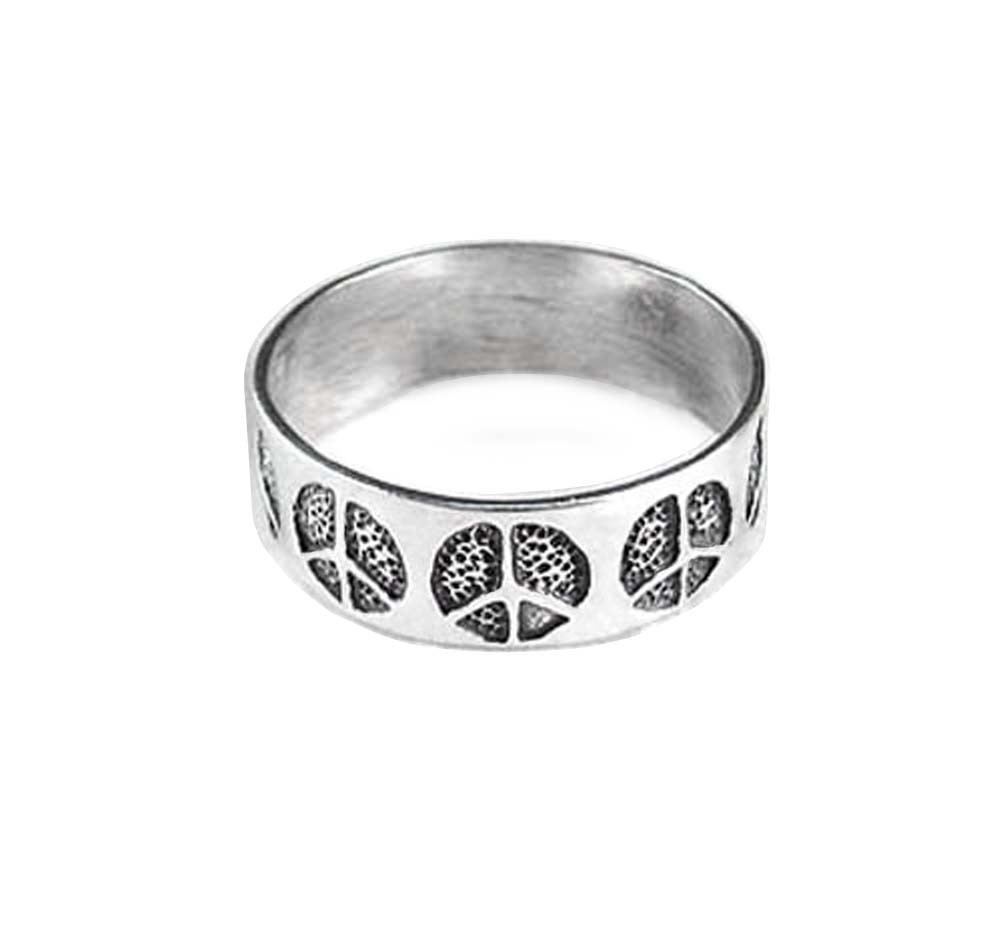 Loading... Please wait...Give peace a chance. A band ring with peace signs stamped all the way around is a great way to show you care about peace, love, and understanding. Sterling silver 925 with antique finish to highlight details. Photo enlarged.