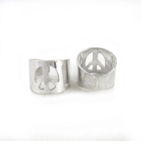 Loading... Please wait...High polished silver with peace sign cut out. Perfect to wear everyday and keep the peace everywhere you go. Photo enlarged to show details. Photo shows two angles of the ear cuff, please note the ear cuff is sold as an individual piece. Sterling silver 925. 5/16 inch wide. 7/16 inch tall. Non-pierced earcuff. Cut out design, polished silver.