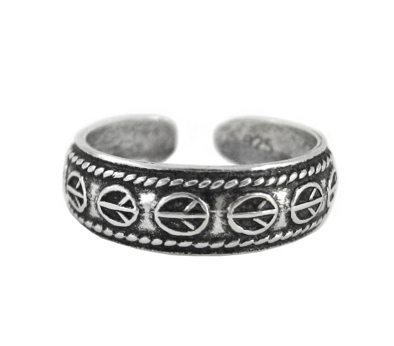 Loading... Please wait...Peace signs going across the toe ring is a great accent on your foot. Toe ring is perfect summer accessorizing. Antique finish on polished silver. Slide on toe ring from the top of the toe, do not bend the band open. Adjustable toe ring accommodates many sizes. Photo enlarged to show details.