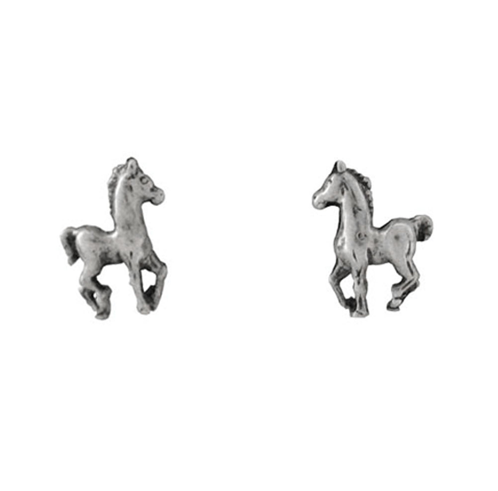 Adorable and very detailed playfully prancing horse post earrings. Horse is approx. 1/4 inch wide by 3/8 inch tall. Antique finish to enhance details. Photo enlarged to show details. Post and butterfly backs for pierced ears.