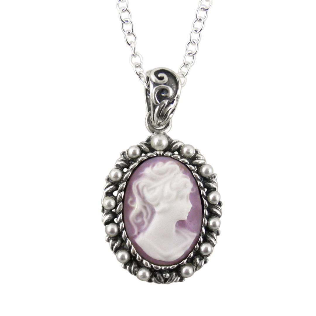 Loading... Please wait...Romantic vintage-style flair cameo surrounded with faux seed pearls pendant necklace. The cameo is resin. The pendant is 3/4" tall (1" with bail) and 9/16" wide. Sterling silver chain is 16" long with a 2" extender. Photo enlarged to show details.