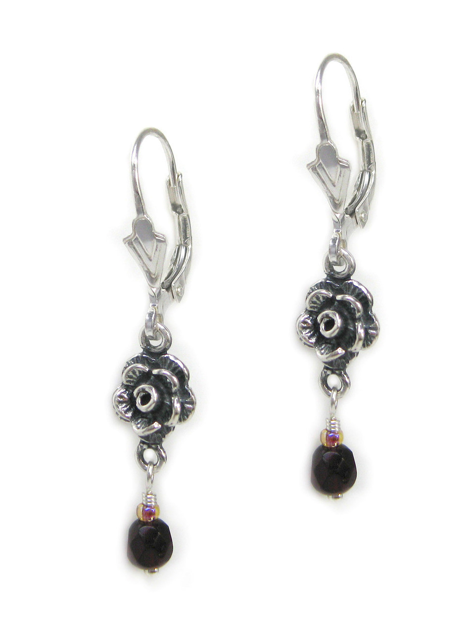 Sterling silver rose charm and crystal drop leverback earrings. Earring is approx. 1 1/2 inch drop from top of hook. Rose charm is approx. 5/16 inch wide (8mm). Crystal is approx. 4mm. Leverback hooks for pierced ears.