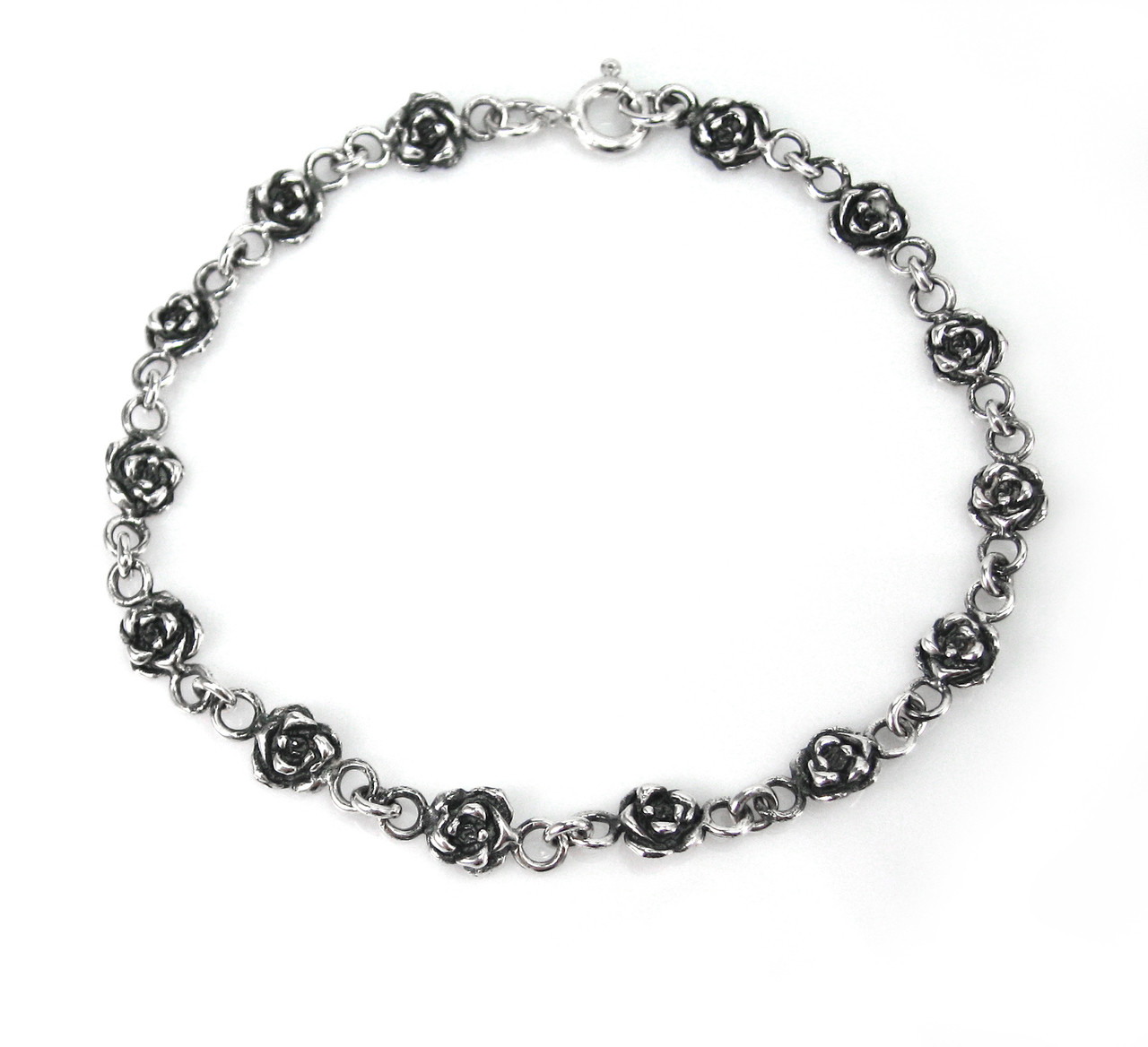 Lovely roses link together on this bracelet. Antique finish. Rose charm is approximately 3/16 inch wide (5mm). Bracelet is approximately 7 1/2 inch long and finishes with a spring lock clasp. Sterling silver.