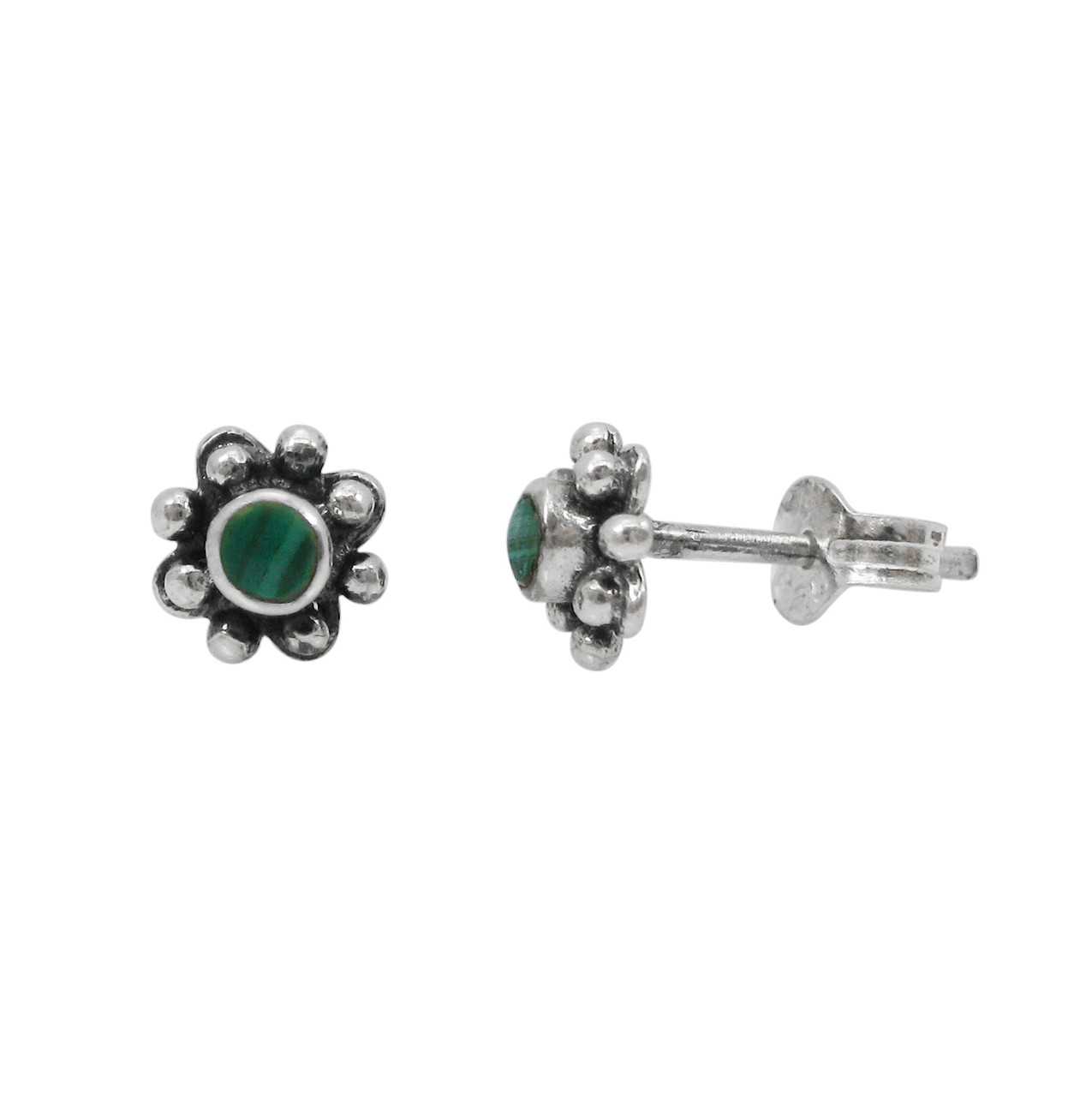 Loading... Please wait...Sterling silver round stone flower with beaded petals post stud earrings. Earrings is approximately 1/4 inch wide (6mm). Small in size and can be worn in the secondary piercing. Reconstituted stone. Post and butterfly backs for pierced ears.