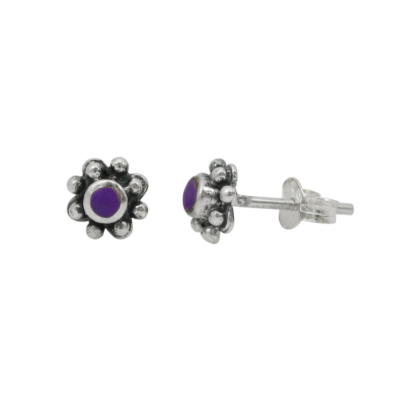 Loading... Please wait...Sterling silver round stone flower with beaded petals post stud earrings. Earrings is approximately 1/4 inch wide (6mm). Small in size and can be worn in the secondary piercing. Reconstituted stone. Post and butterfly backs for pierced ears.