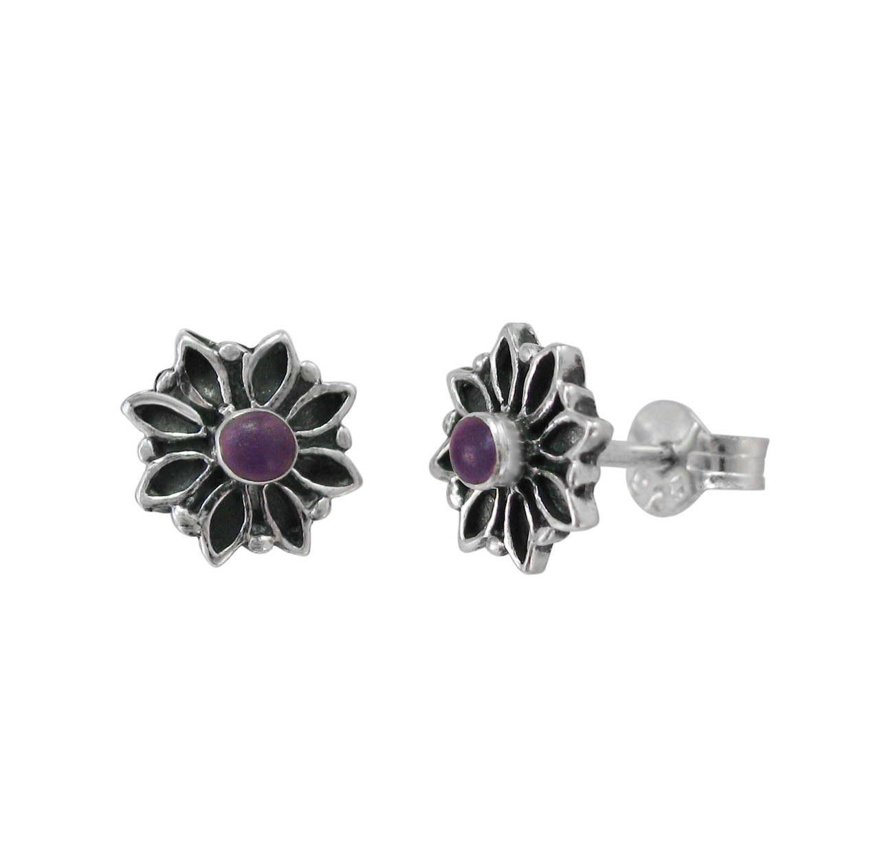 Round stone center flower burst details sterling silver frame. Flower is approximately 5/16 inch wide (8mm). Materials: 925 sterling silver and reconstituted stone. Antique finish. Photo enlarged to show details.
