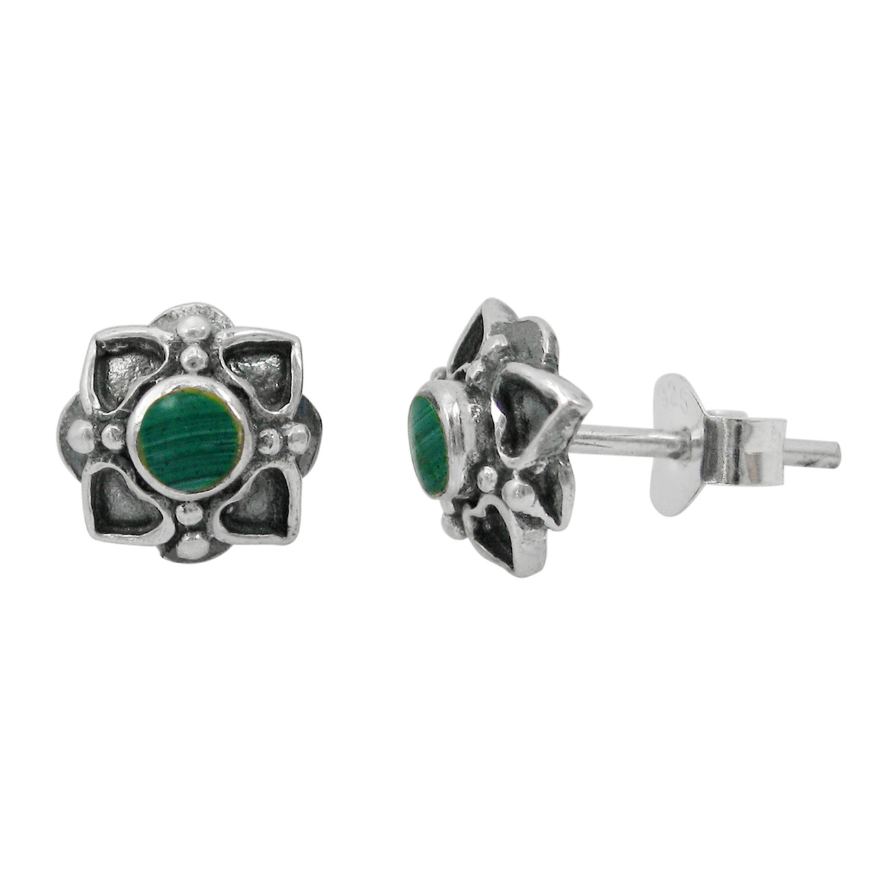 Click the button below to add the Sterling Silver Round Stone Four Corners Flower Post Stud Earrings, Malachite to your wish list.