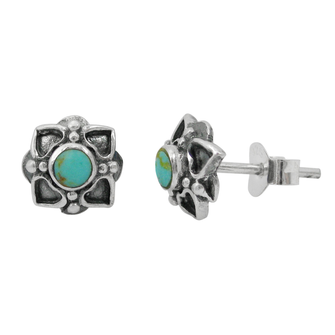 Sterling silver round stone at the center of a four corners flower post stud earrings. Earring is approximately 5/16 inch wide (8mm) and 5/16 inch tall (8mm). Reconstituted stone. Post and butterfly backs for pierced ears.