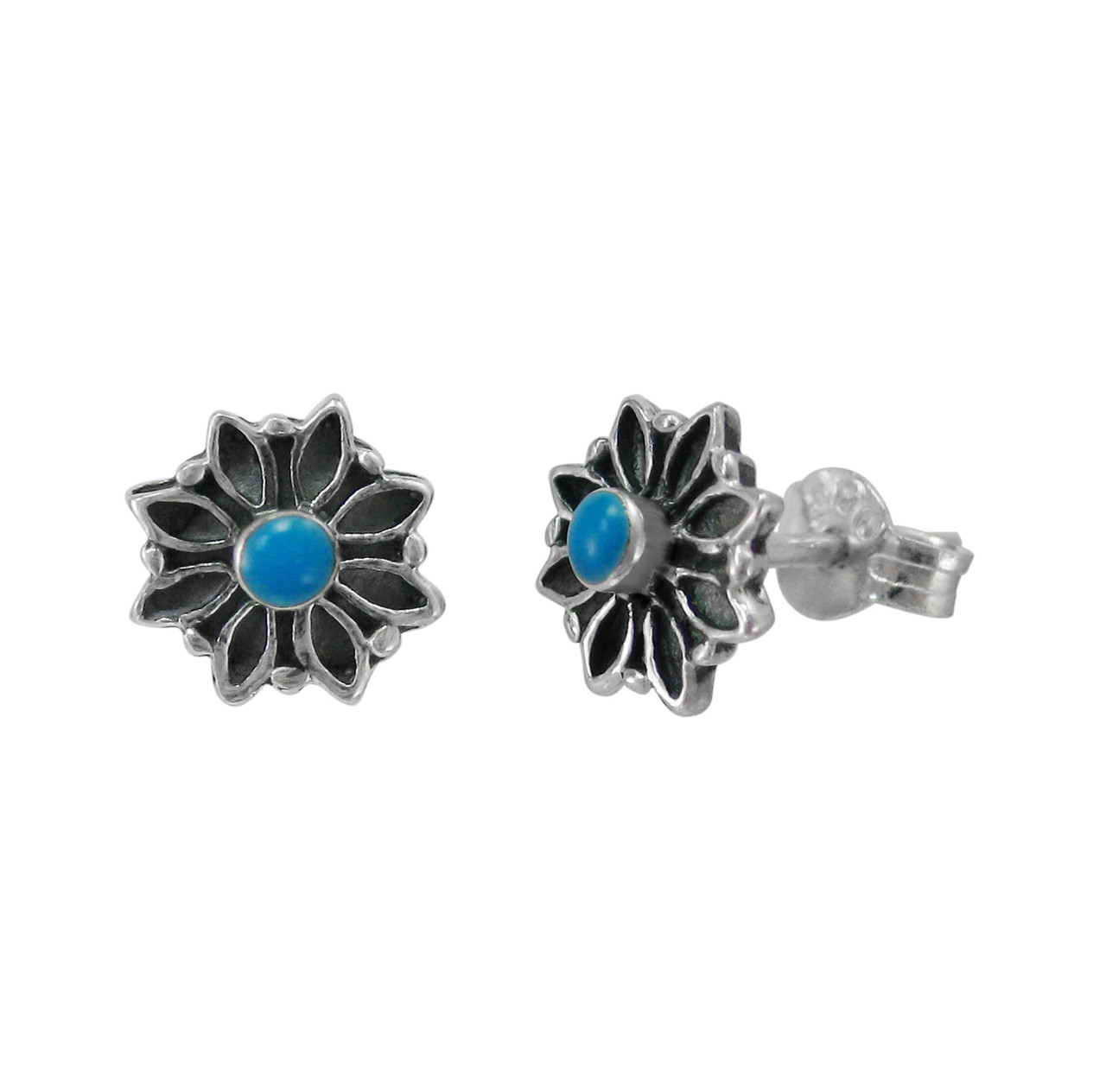 Click the button below to add the Sterling Silver Round Stone with Flower Frame Stud Post Earrings, Turquoise to your wish list.