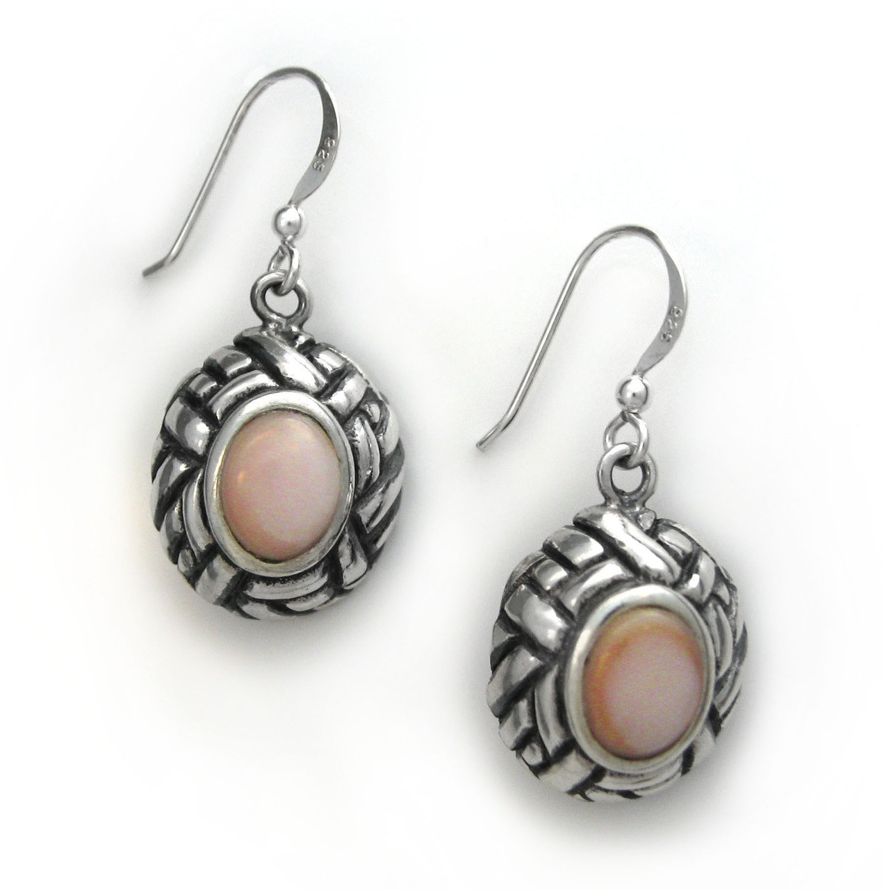 Loading... Please wait...Basket weave pattern frame and iridescent shell drop earrings. Timeless and beautifully design that will take you from the office to a casual weekend. Nice size to be notice and comfortable to wear. Antique finish to enhance the weaving pattern. Shells are natural and no two are identical. Photo enlarged to show details.