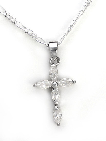 Sparkling cross on chain necklace. Marquise crystals sparkle and lend elegant, refine look to this cross. Pendant hangs from Figaro chain. Photo enlarged to show details.
