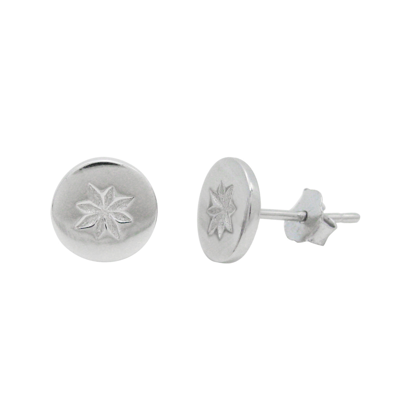 Sterling silver star on round stud post earrings. Earring is approximately 5/16 inch (8mm) wide. Post and butterfly backs for pierced ears.
