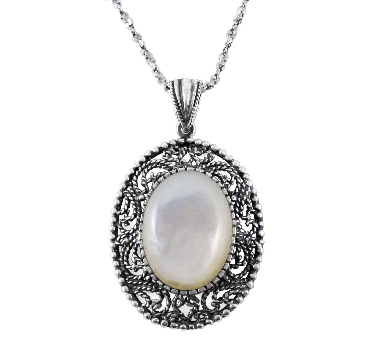 Loading... Please wait...Ornate swirls filigree frame with antique finish is the perfect setting for these gorgeous stones to really shine. Due to the natural property of stones, please allow for difference in stone appearance. Sterling silver 925 with antique finish. Approx. 15/16 inch wide. Approx. 1 1/2 inch tall including bail. Includes antique sterling chain.