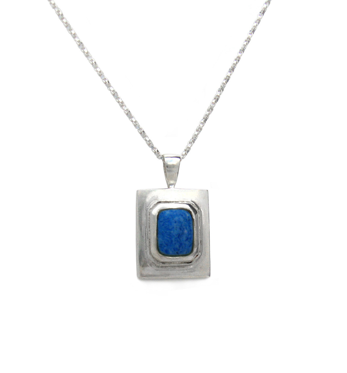 Bold and sleek rectangle pendant set with smooth stone. Chain has a textures look that complement the polished silver pendant. Sterling silver and reconstituted stone. Photo enlarged to show details.