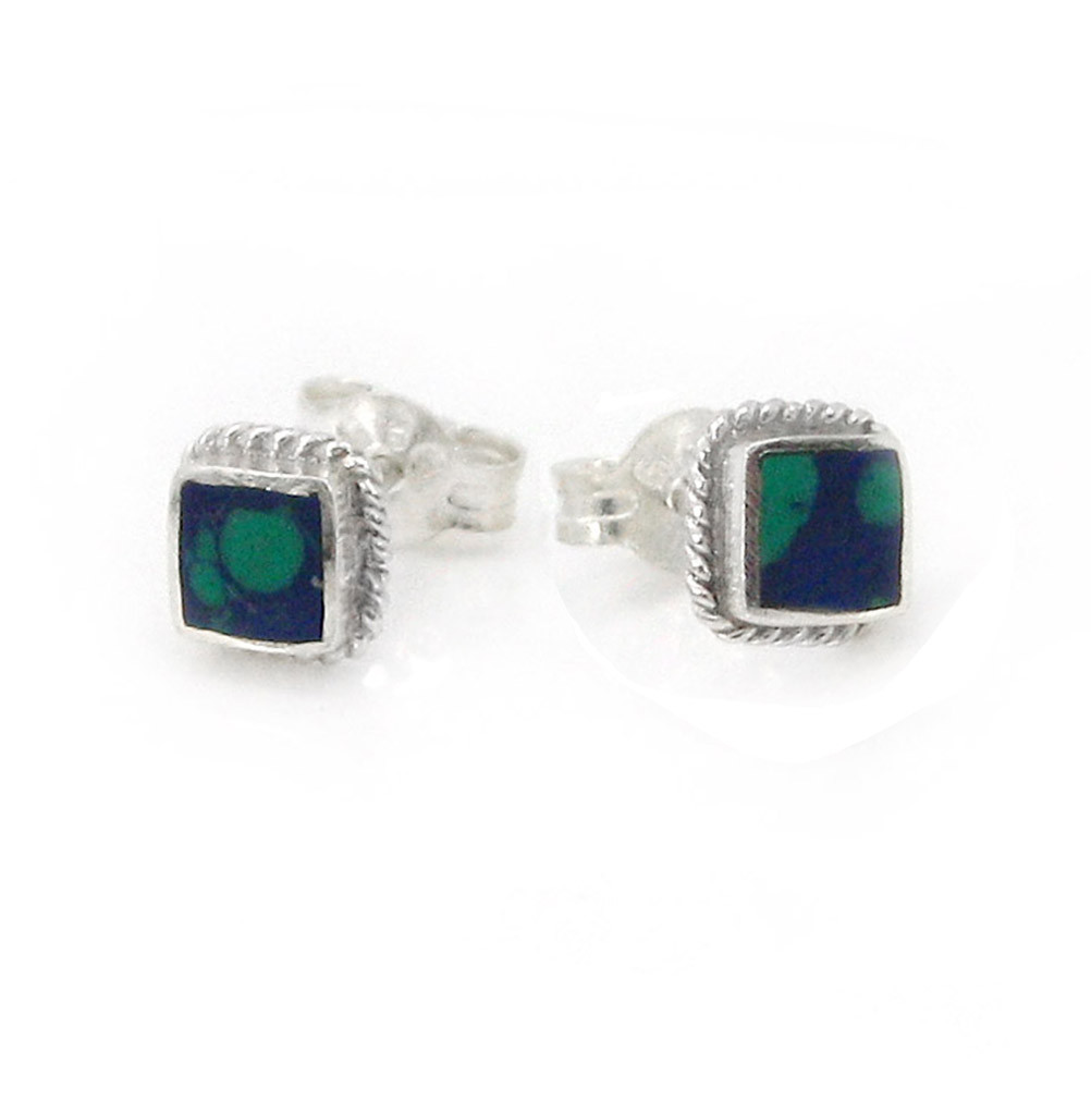 Loading... Please wait...Small little square of color surrounds with twist rope design for your ears. Perfect to wear everyday and small enough to wear on the secondary piercing. 4mm reconstituted stone inlay and sterling silver. Please allow for variations in the appearance of the stones. Photo enlarged to show details.