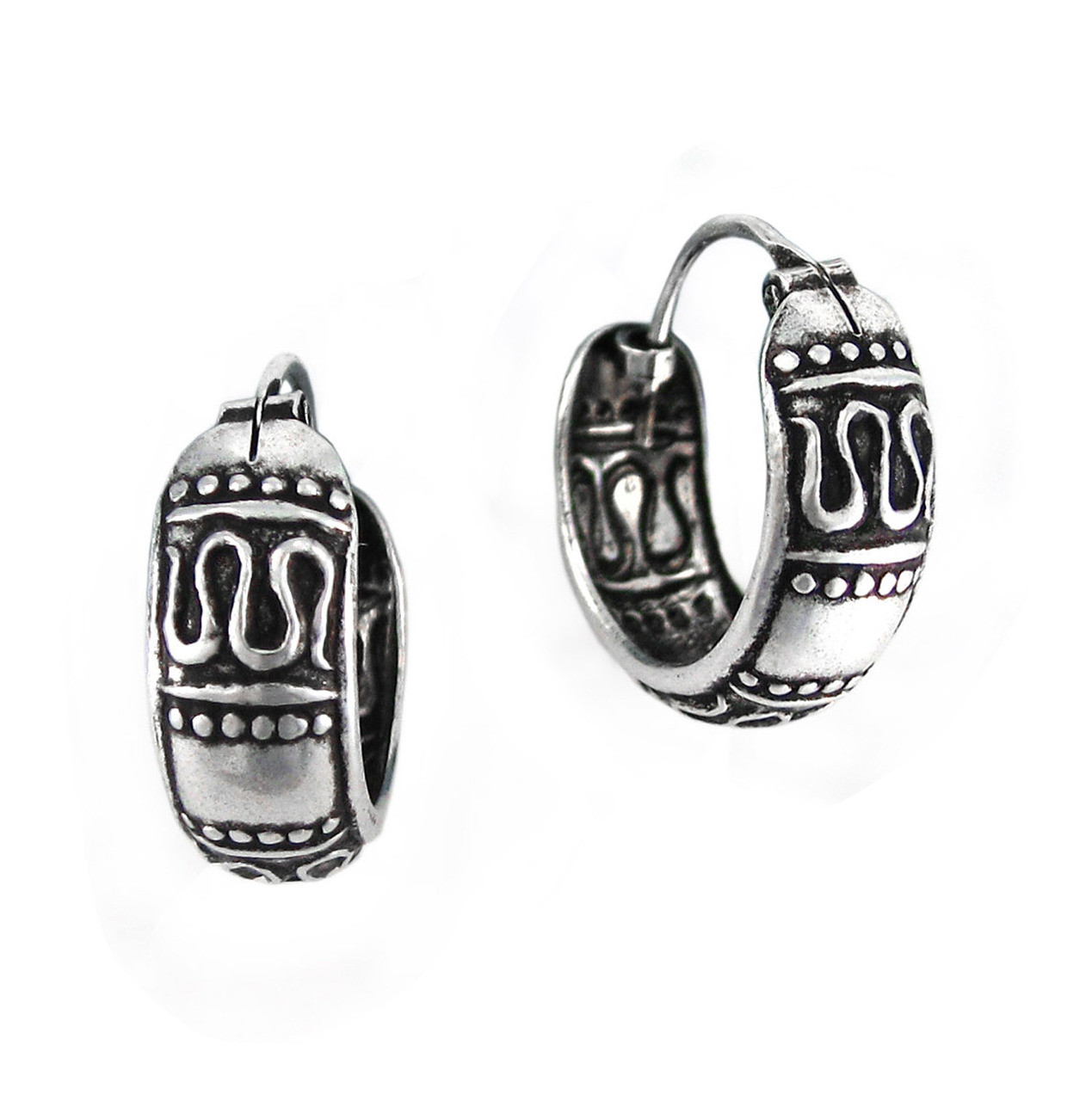 Loading... Please wait...Sterling silver 15mm hoop with Bali swirl design. Antique finish. Nice size to be noticed and still light enough to comfortably leave in and wear everyday. Earring is approx. 7/16 inch wide (15mm). Hoop is approx. 3/16 inch band (5mm). Photo enlarged to show details.