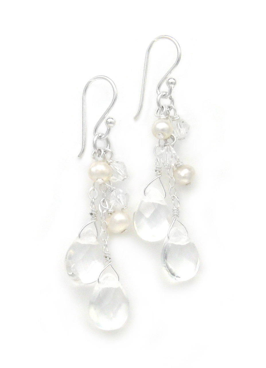 Sterling silver teardrop stones and accent beads cascading drop earrings. Elegant mixture of different cut crystals and cultured pearls. Earrings are approximately 1 3/4 inch drop including hook. Fishhooks for pierced ears.
