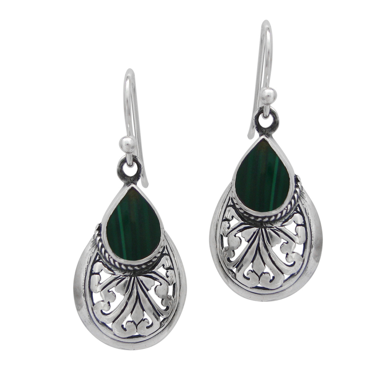 Sterling Silver Teardrop Stone Scrolls "Sofie Anne" Earrings, Malachite