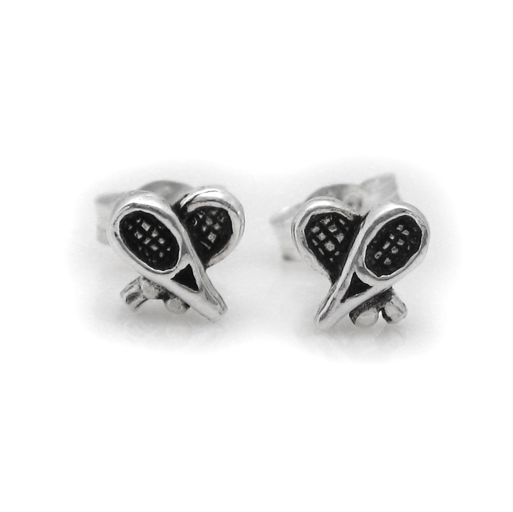 Loading... Please wait...Sterling silver two tennis racklets crossing stud post earrings. There's a small ball wedged in between the bottom of the rackets crossed. Very small in size stud earrings but has all the details. Earrings measures approx. 3/16 inch wide (5mm). 3/16 inch tall (5mm). Post and butterfly backs for pierced ears.
