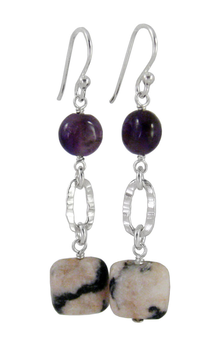 Loading... Please wait...Lovely geometric shape and colorful gemstones combined link drop earrings. Earring is approximately 1 15/16 inch long including hook. Oval textured charm link with geometrically cut amethyst and rhodonite stones in this beautiful earring.