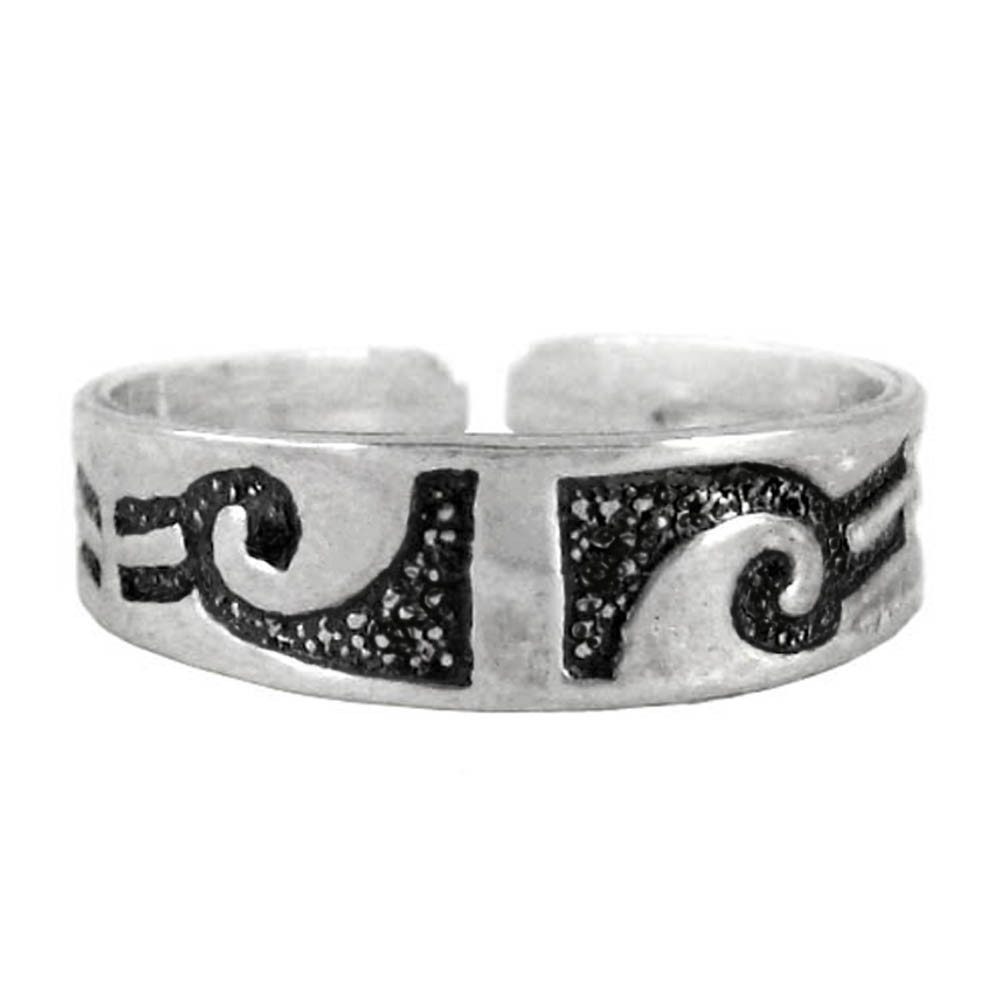 Loading... Please wait...Tribal design on polished band toe ring is a great accent on your foot. Band toe ring is perfect summer accessorizing. Antique finish on polished silver. Band slightly tapers to the back for comfort. Slide on toe ring from the top of the toe, do not bend the band open. Adjustable toe ring accommodates many sizes. Photo enlarged to show details.