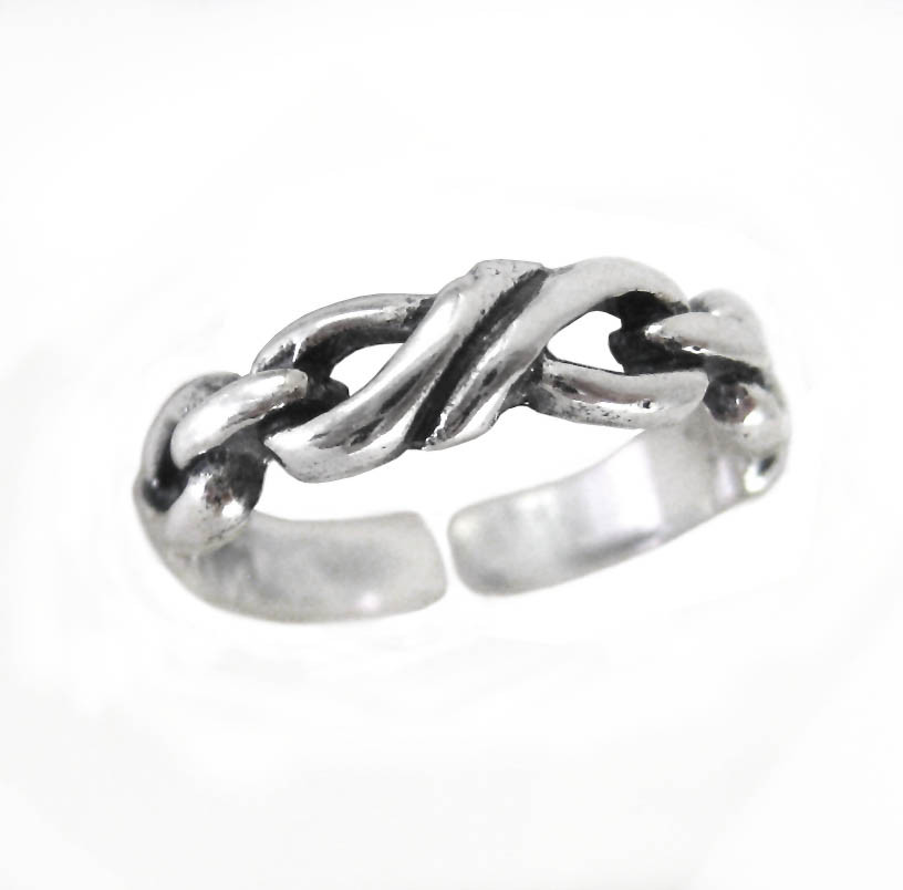 Loading... Please wait...Twist link design toe ring is a great accent on your foot. Toe ring is perfect summer accessorizing. Antique finish on polished silver. Slide on toe ring from the top of the toe, do not bend the band open. Adjustable toe ring accommodates many sizes. Photo enlarged to show details.