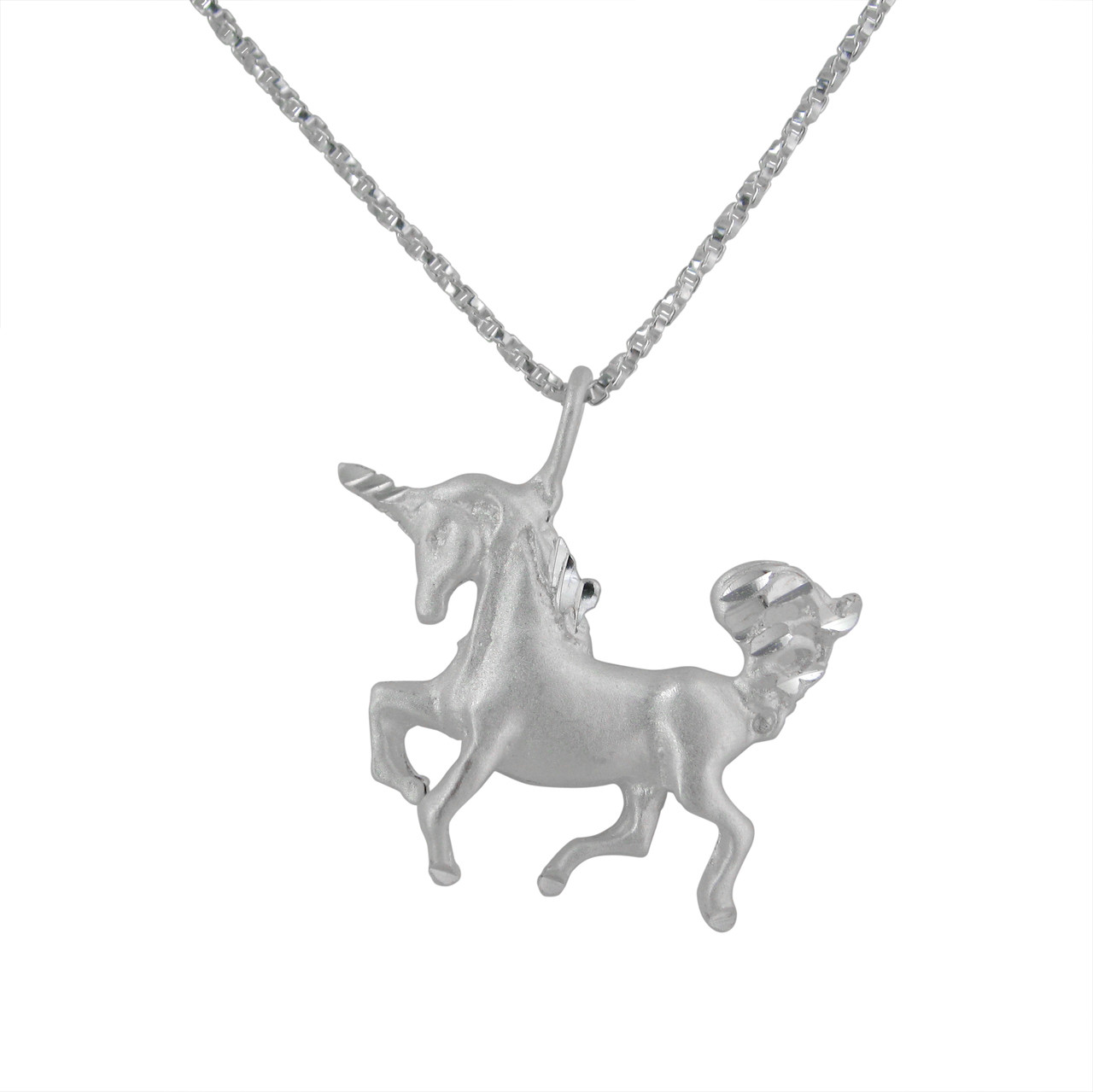 Sterling silver unicorn pendant necklace. Matte finish and etched details. Charm is approximately 15/16 inch wide (24mm). 15/16 inch tall with bail (24mm). Sterling silver chain is included.