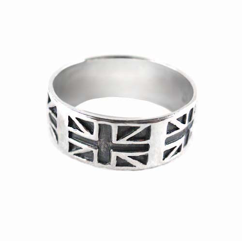 Loading... Please wait...A great ring for anglophiles. Sterling silver Union Jack flag band ring. The size is suitable for both men and women. Please note written dimensions as photo is enlarged to show detail. Please order a half or one whole size up from your normal size due to thickness of the band ring. Band is 8 mm wide. Antique finish.