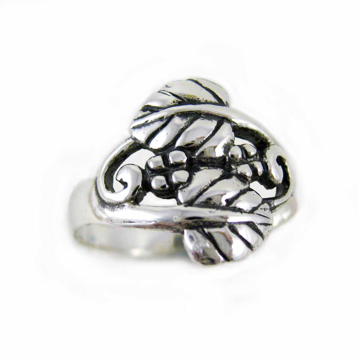 Vine swirls, leaves, and small flowers adorn this ring. Design inspired from the vineyard with rows of grapevines about to bloom. Antique finish. Photos enlarged to show details, please see features for measurements.