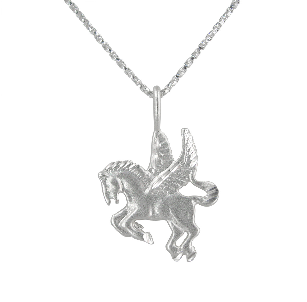 Sterling silver winged pegasus pendant necklace. Matte finish and etched details. Charm is approximately 3/4 inch wide (20mm). 1 3/16 inch tall with bail. Sterling silver chain is included.