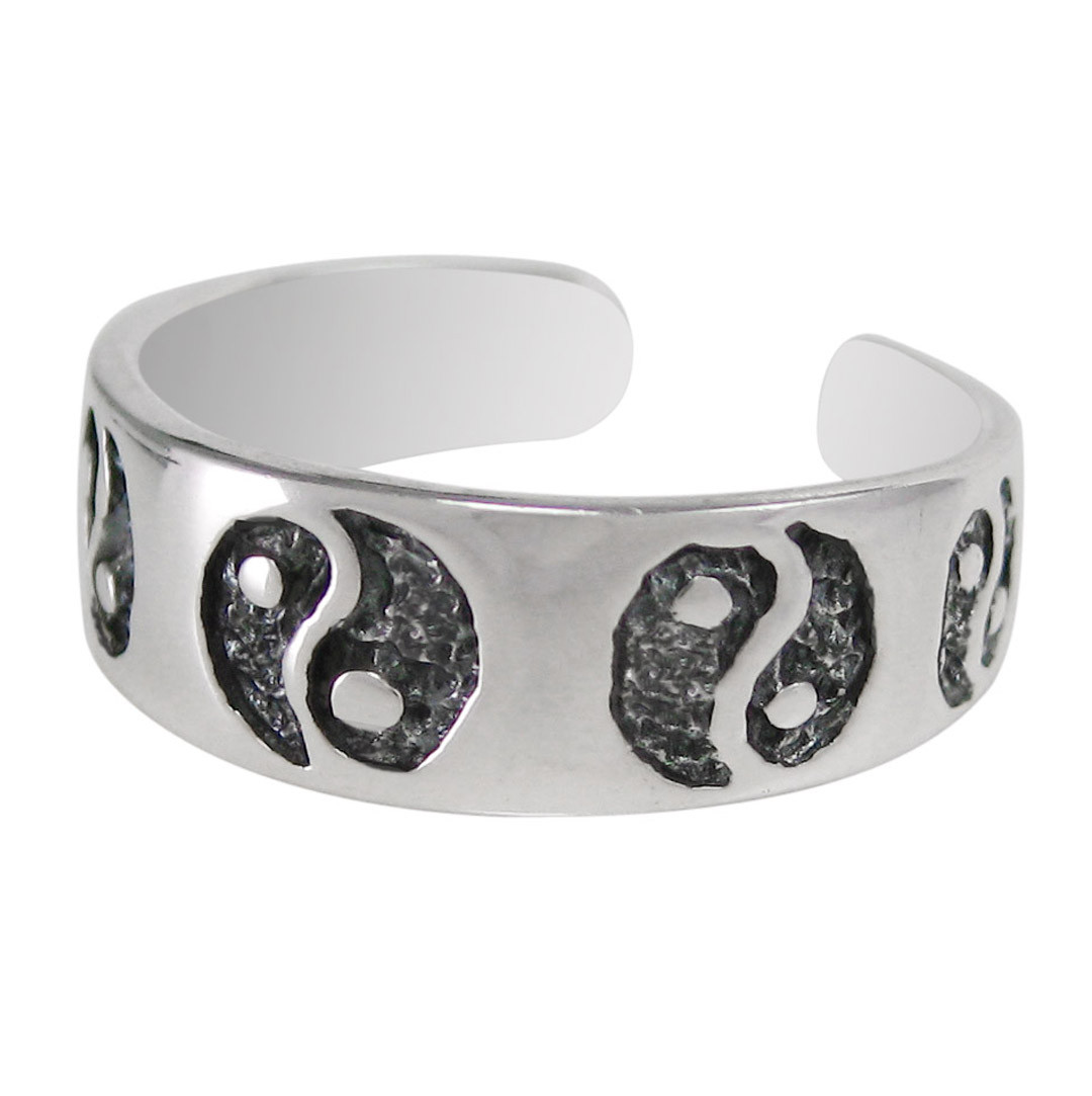 Sterling silver Yin Yang band adjustable toe ring. Band is approx. 3/16 inch tall at the front and tapers slightly to the back for comfort. Band is approx. 5/8 inch wide. Antique finish.