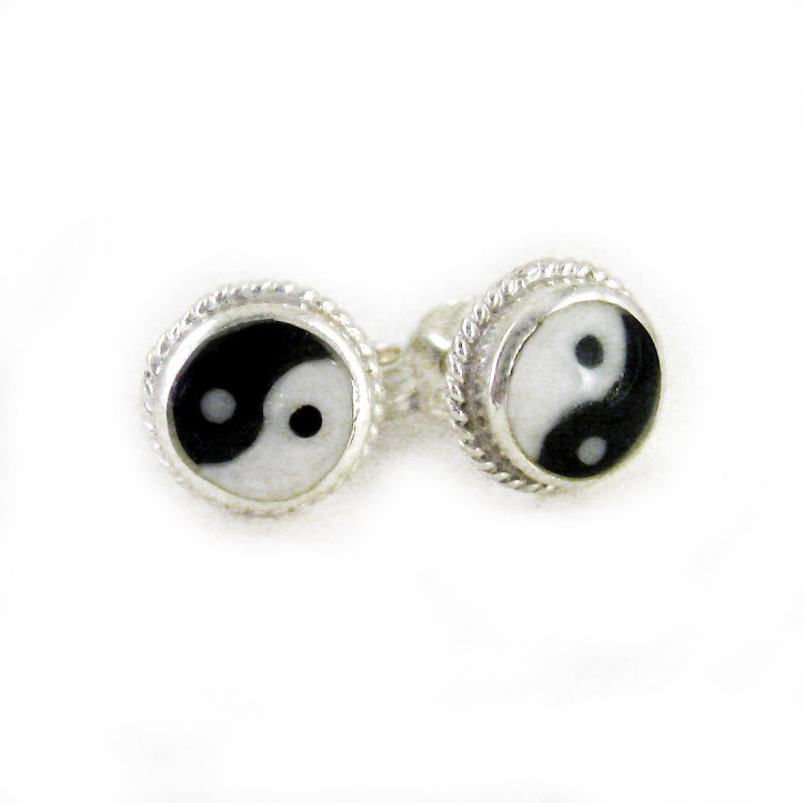 Yin and Yang symbol set in polished silver frame with small twist rope details post earrings. Yin and yang are symbolic of two forces joining together to form a balanced union. Perfect for everyday wear. 925 sterling silver. Post earrings with butterfly back. Photo enlarged to show details. Yin and Yang is 6mm (about 1/4") wide. Total widlth including rope design base is 7mm. Almost 1/8" inch thick. Post and butterfly backs for pierced ears.